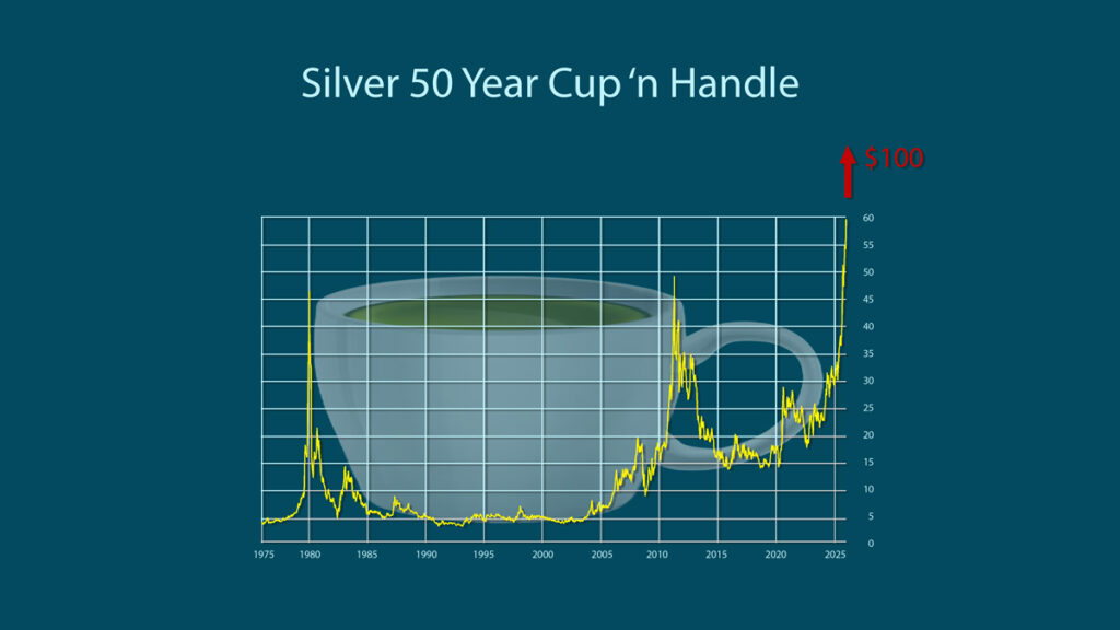 The behind-the-scenes market realities driving silver’s impending short squeeze have been mirrored on the price chart through a 50-year cup-and-handle formation. Silver first hit the $50/oz level in 1980 before collapsing and spending decades grinding lower.